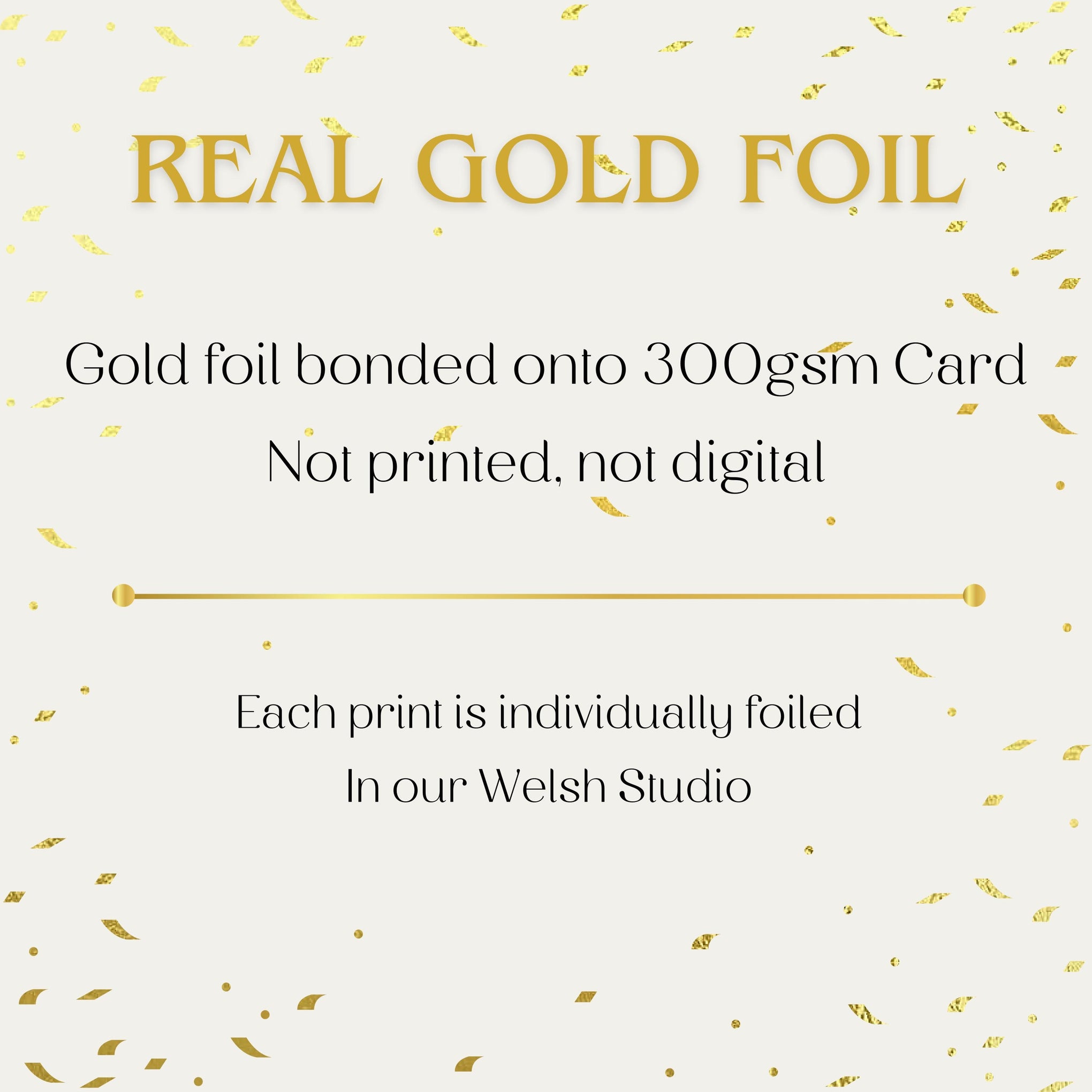 Our gold foil prints are created using genuine foil (not a digital effect), giving each piece a luxurious, premium finish. The foiling process may naturally result in tiny specks or foil particles around the design – this is a characteristic of genuine foiling and demonstrates the authentic, handcrafted nature of your piece. Each print is carefully created in our studio, making every keepsake uniquely special.