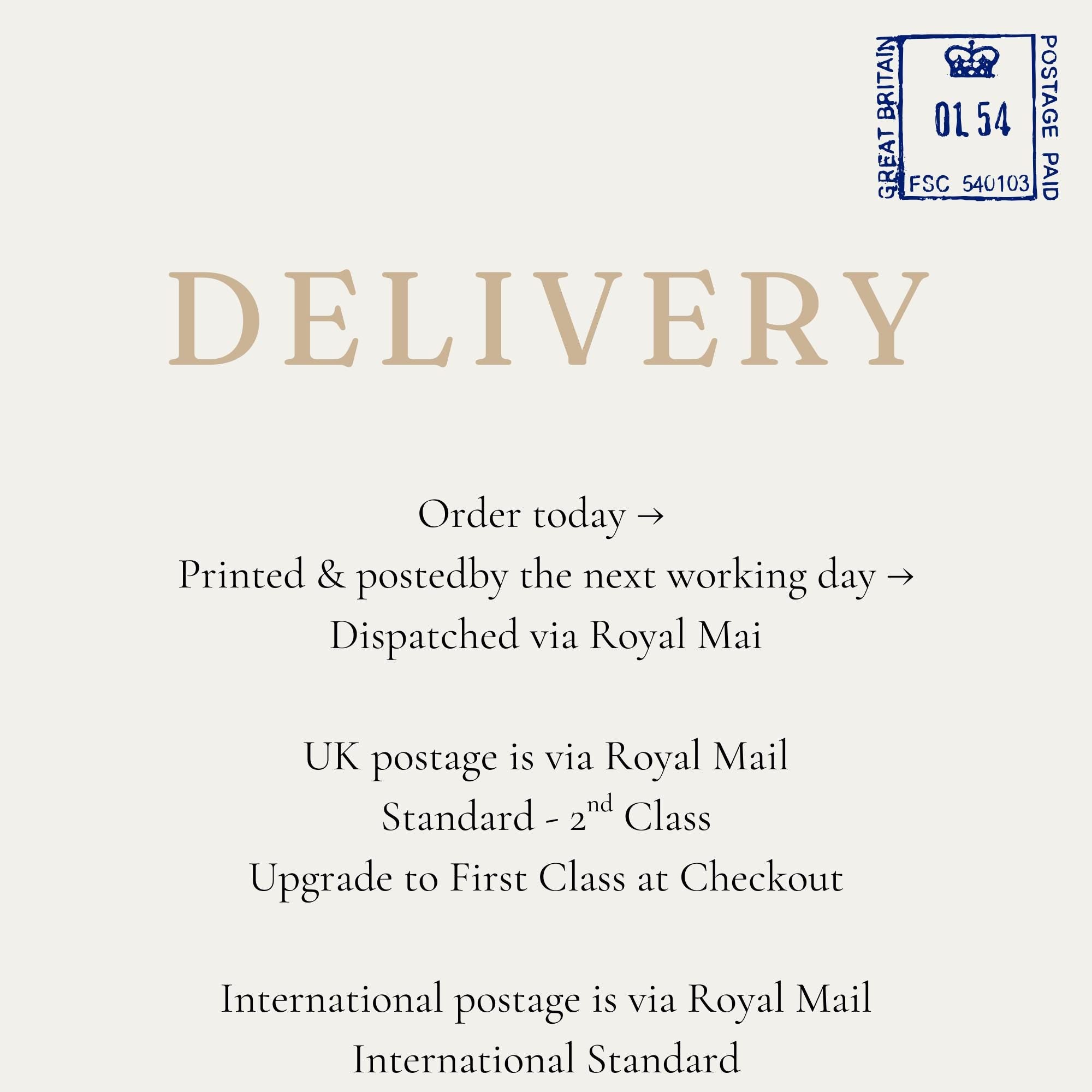 Our cards are 6x6 inches and printed on luxurious 300gsm textured cardstock, accompanied by a premium white envelope. Every design is printed and packed in our West Wales studio with care and attention to detail.