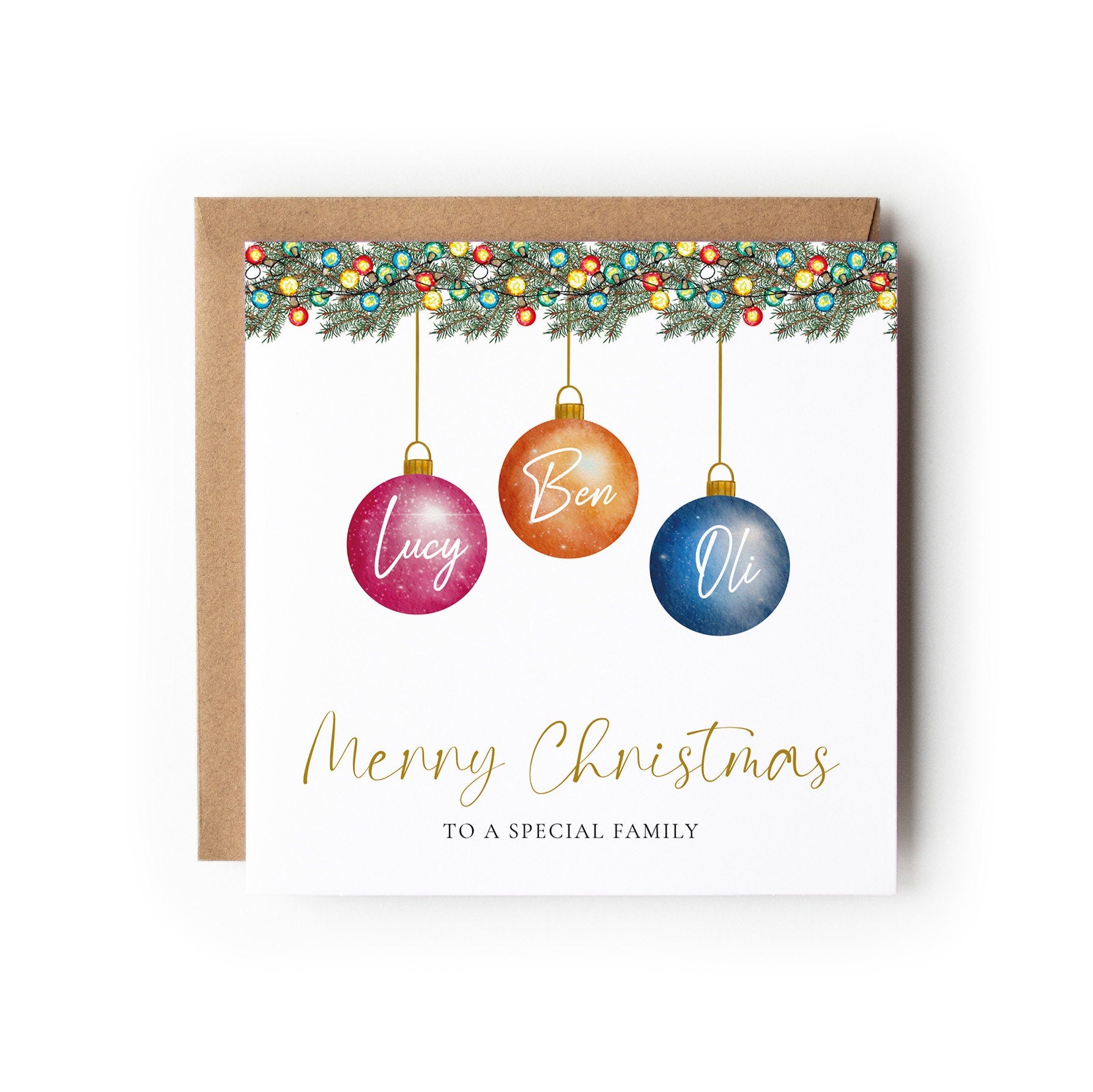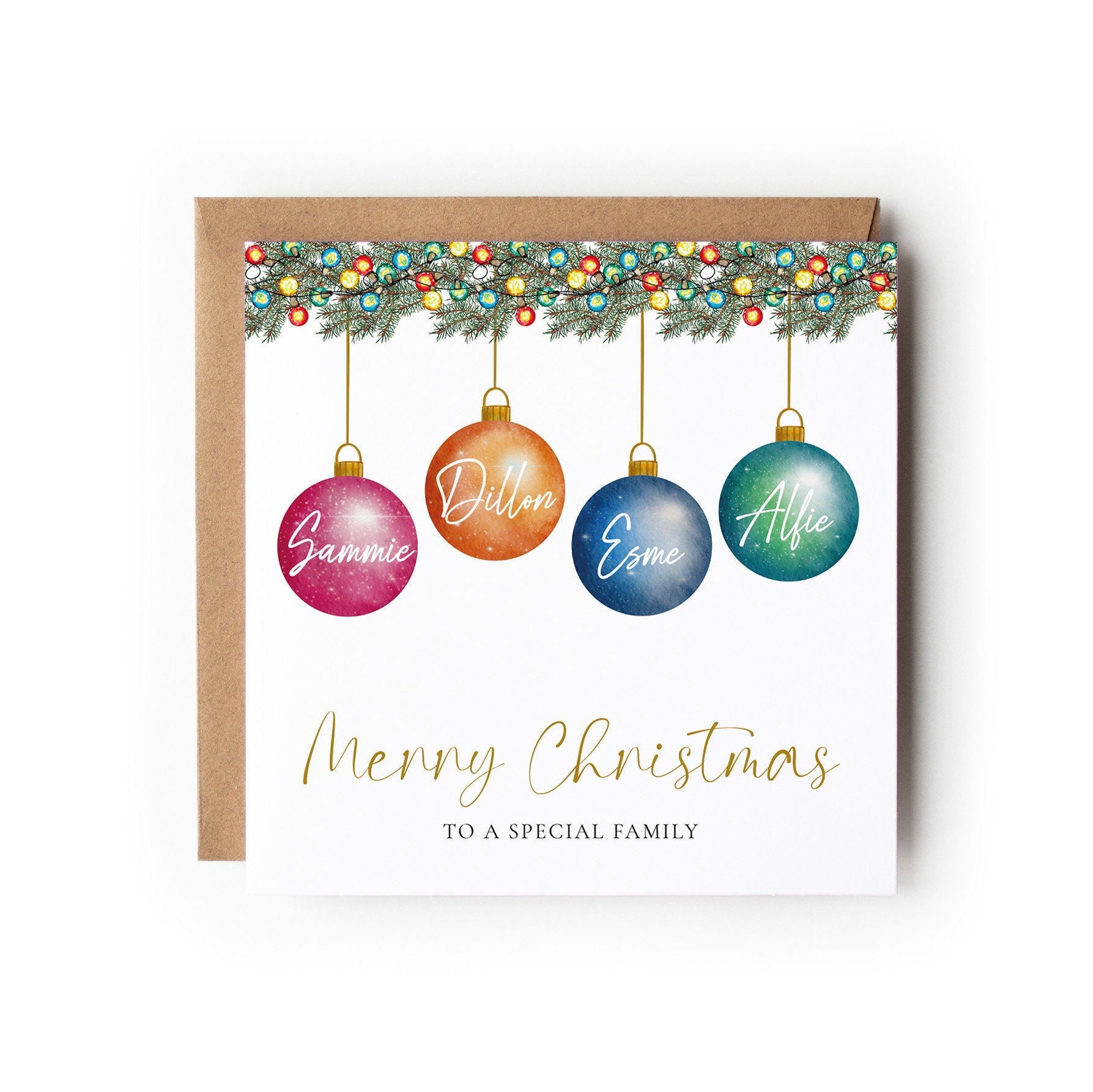 A personalised bauble Christmas card featuring each family member’s name on a festive ornament. Finished with a garland detail and elegant gold script, this design is a beautiful way to celebrate a special family this holiday season.