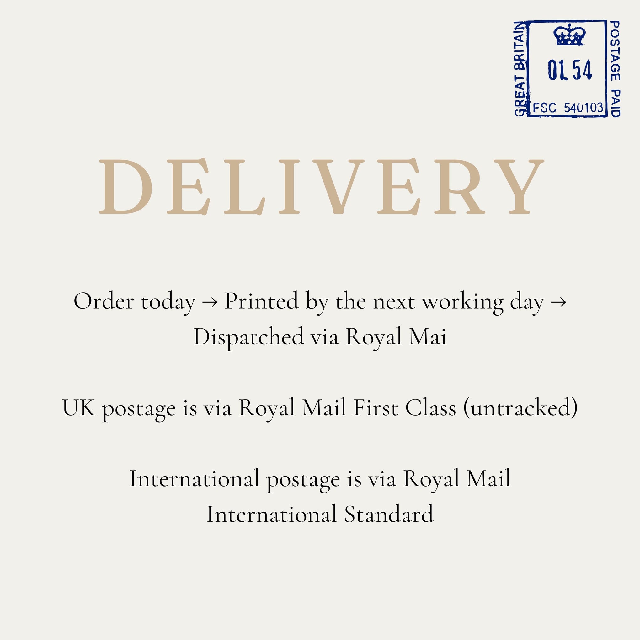 Our cards are 6x6 inches and printed on luxurious 300gsm textured cardstock, accompanied by a premium white envelope. Every design is printed and packed in our West Wales studio with care and attention to detail.