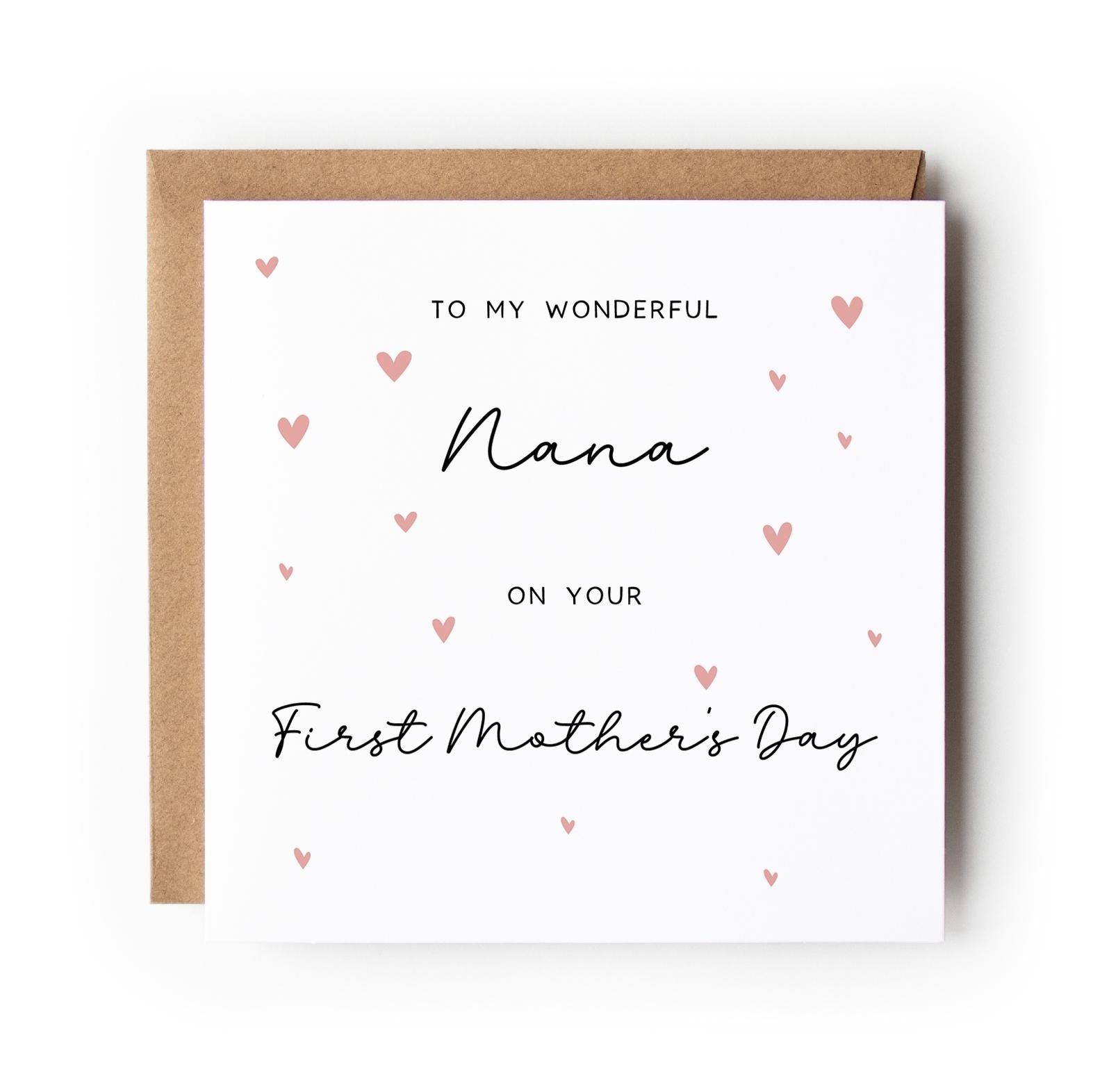 A personalised First Mother’s Day card featuring a watercolour heart design, with the name changed to suit, such as Nana, Grandma, Granny or any name you prefer. A thoughtful way to mark a first Mother’s Day with wording that feels personal and just right for your family.