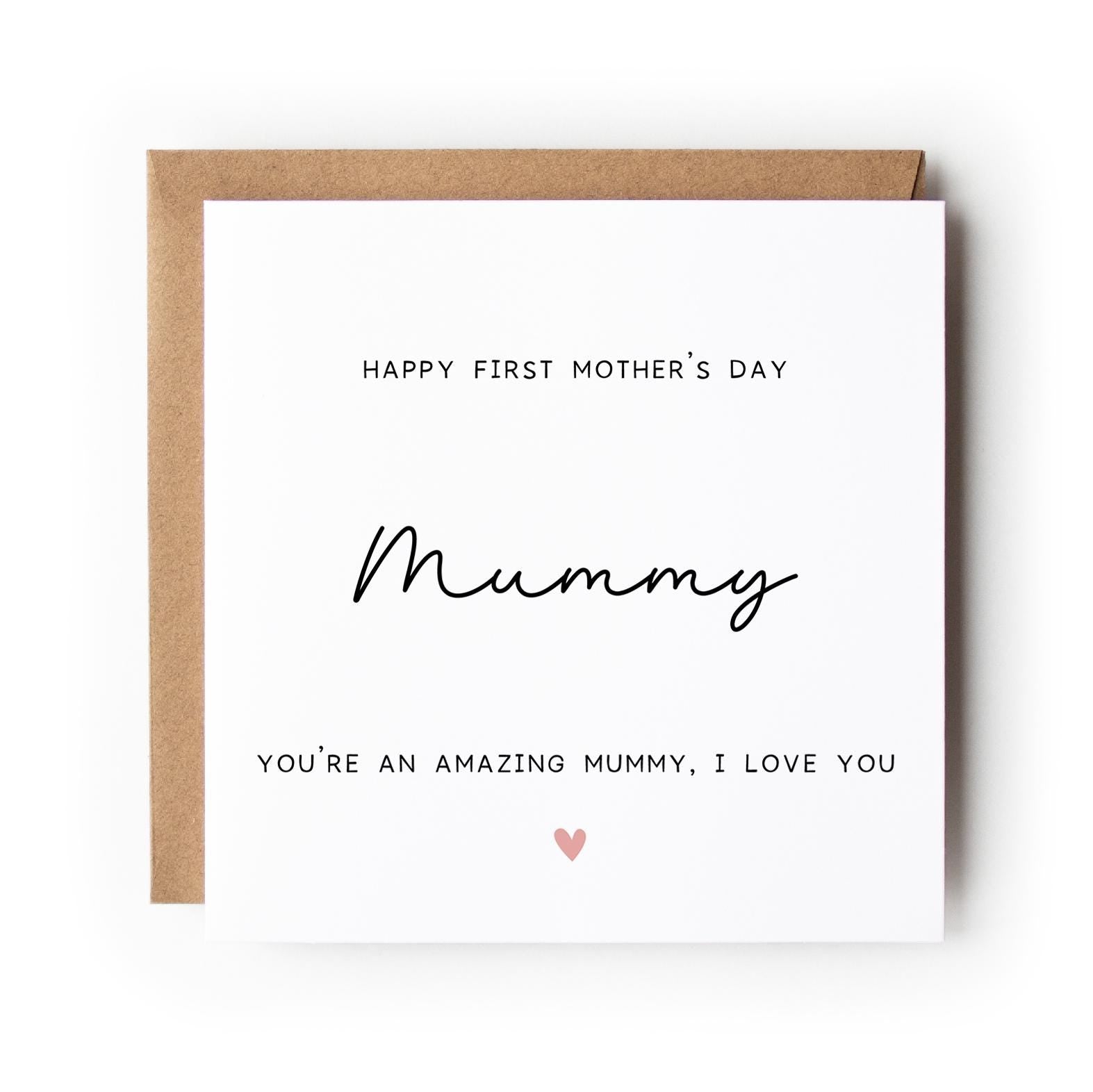 A lovely personalised first Mother’s Day card featuring a simple heart design. A lovely choice to give Mum on her first Mother’s Day.
