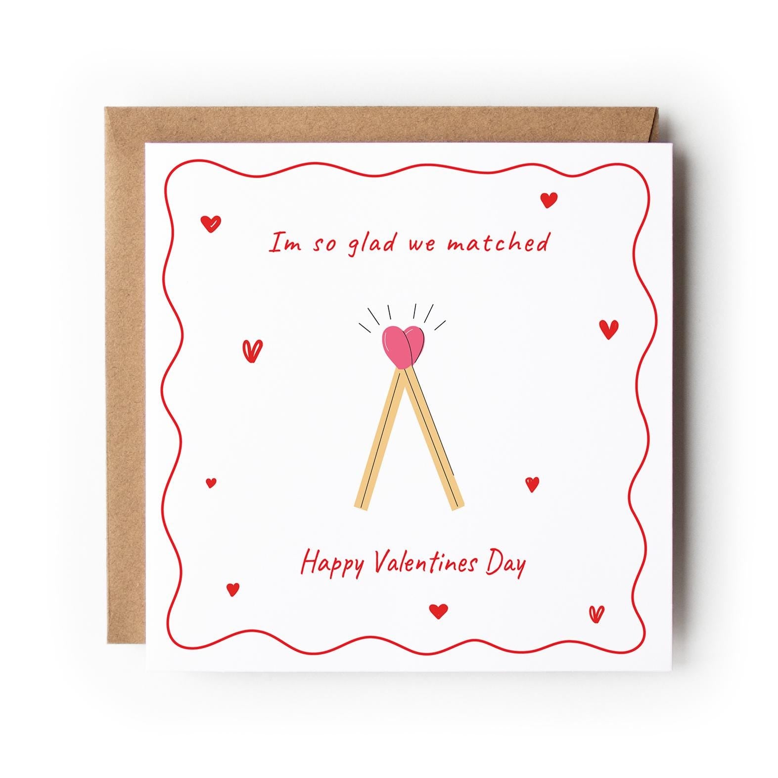 A sweet Valentine card featuring two matchsticks forming a heart with the words Im so glad we matched, framed by hand drawn hearts and a soft red border, a simple and thoughtful design for celebrating love in a playful way.