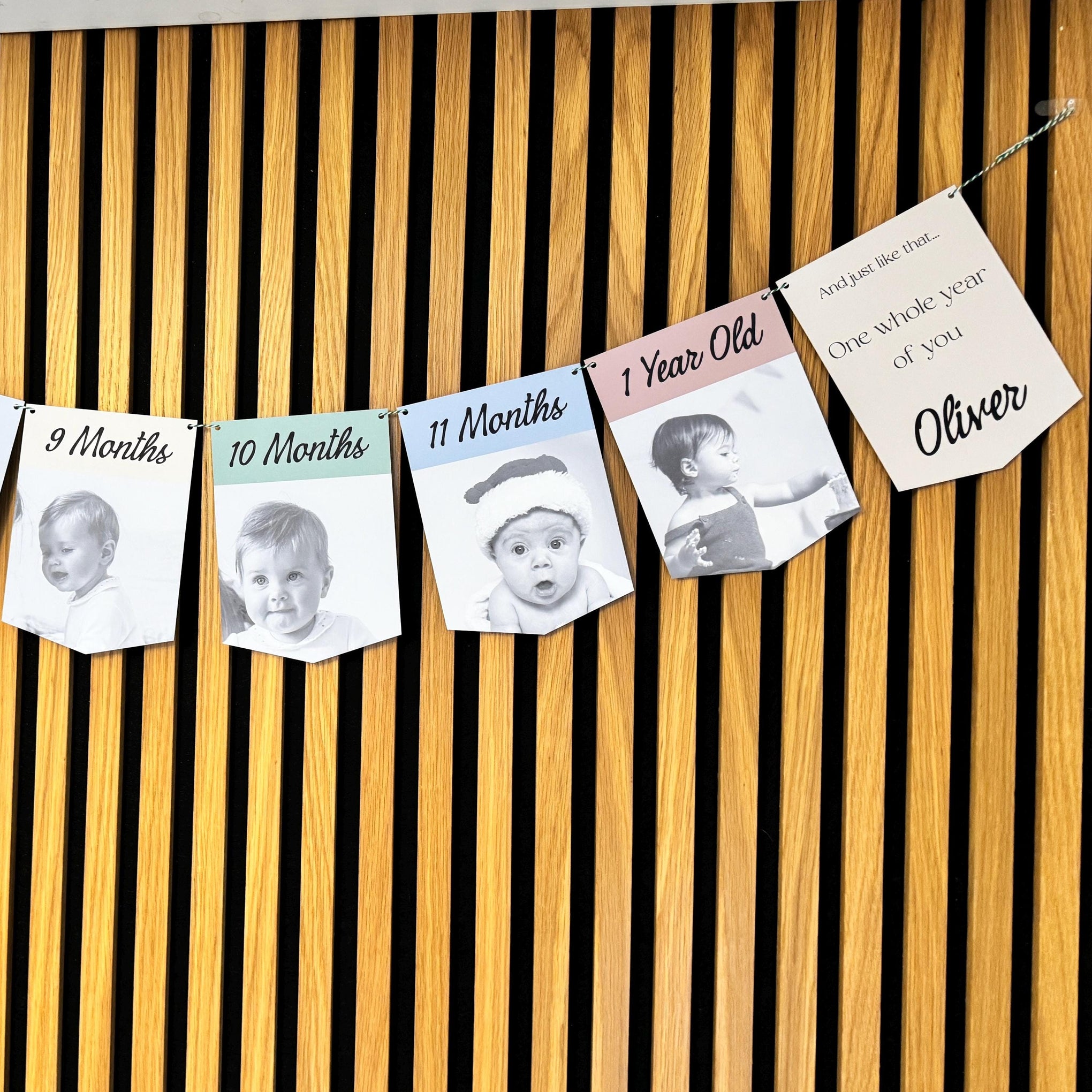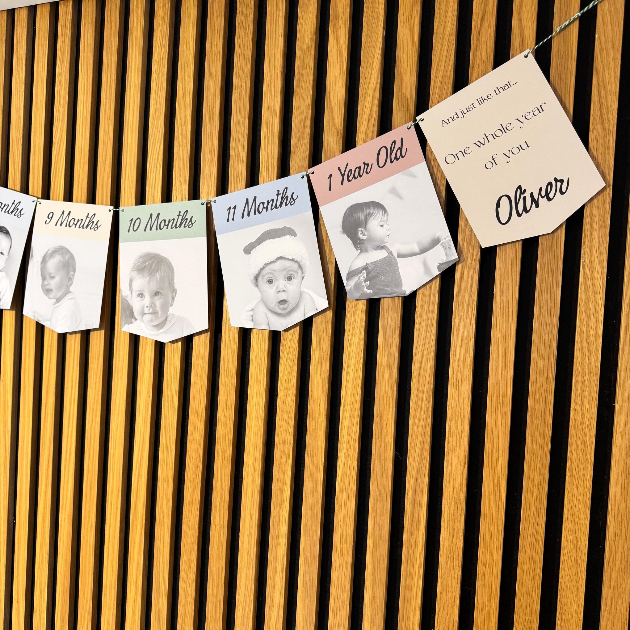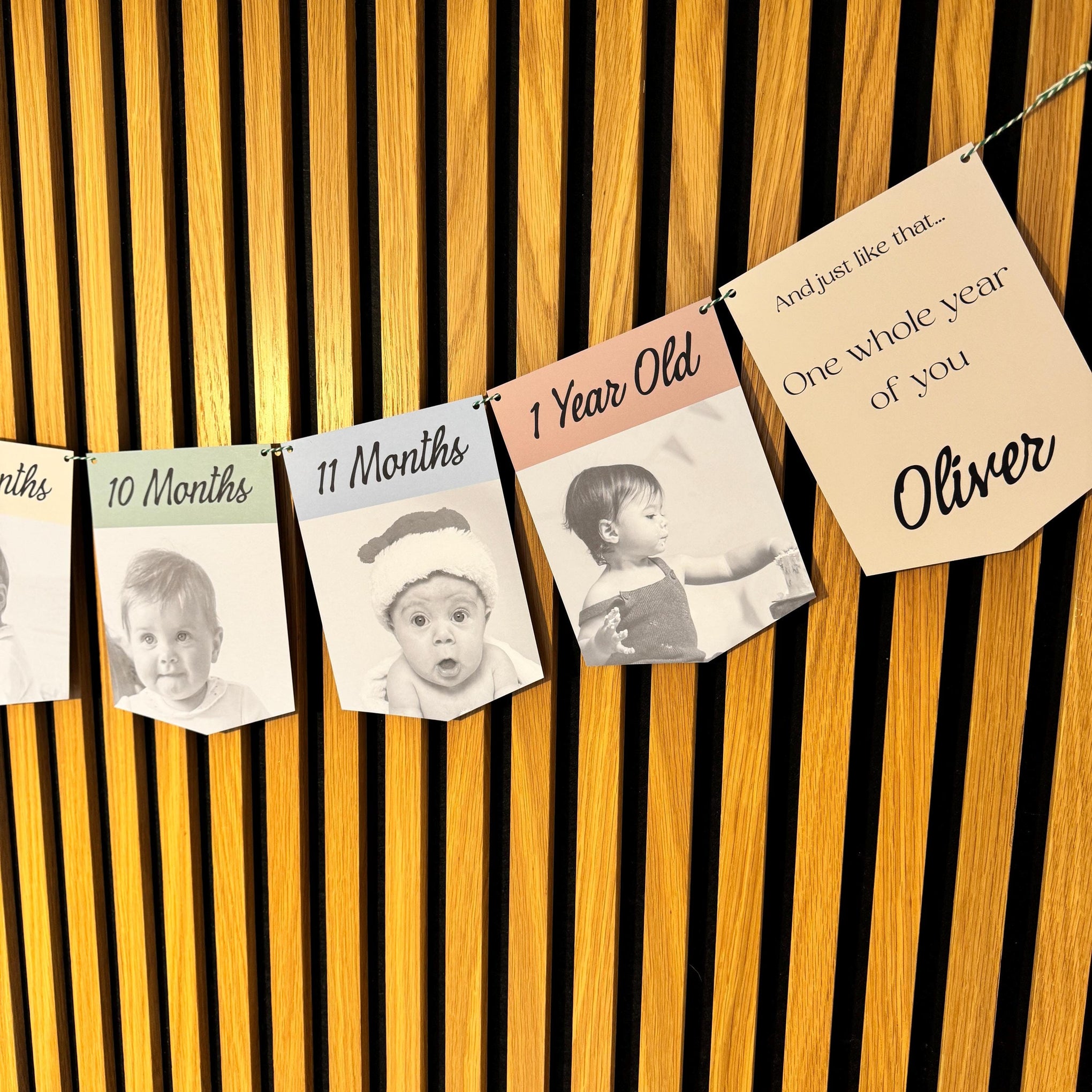 Celebrate your baby’s first year with a beautiful personalised photo bunting banner featuring their milestones from Day 1 to 1 Year Old. This keepsake-style banner is made using your own photos and your chosen colour palette, creating a meaningful decoration for a first birthday party and a lovely memory to keep afterwards.