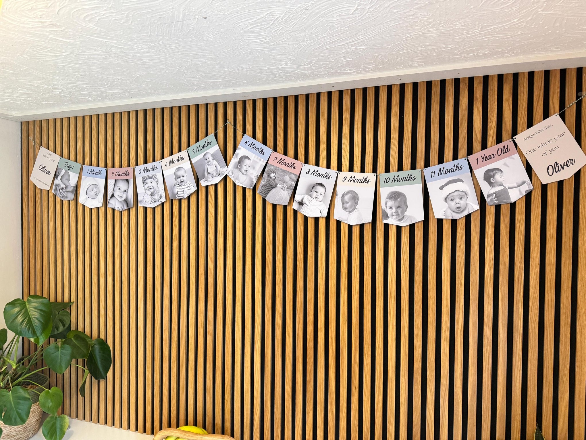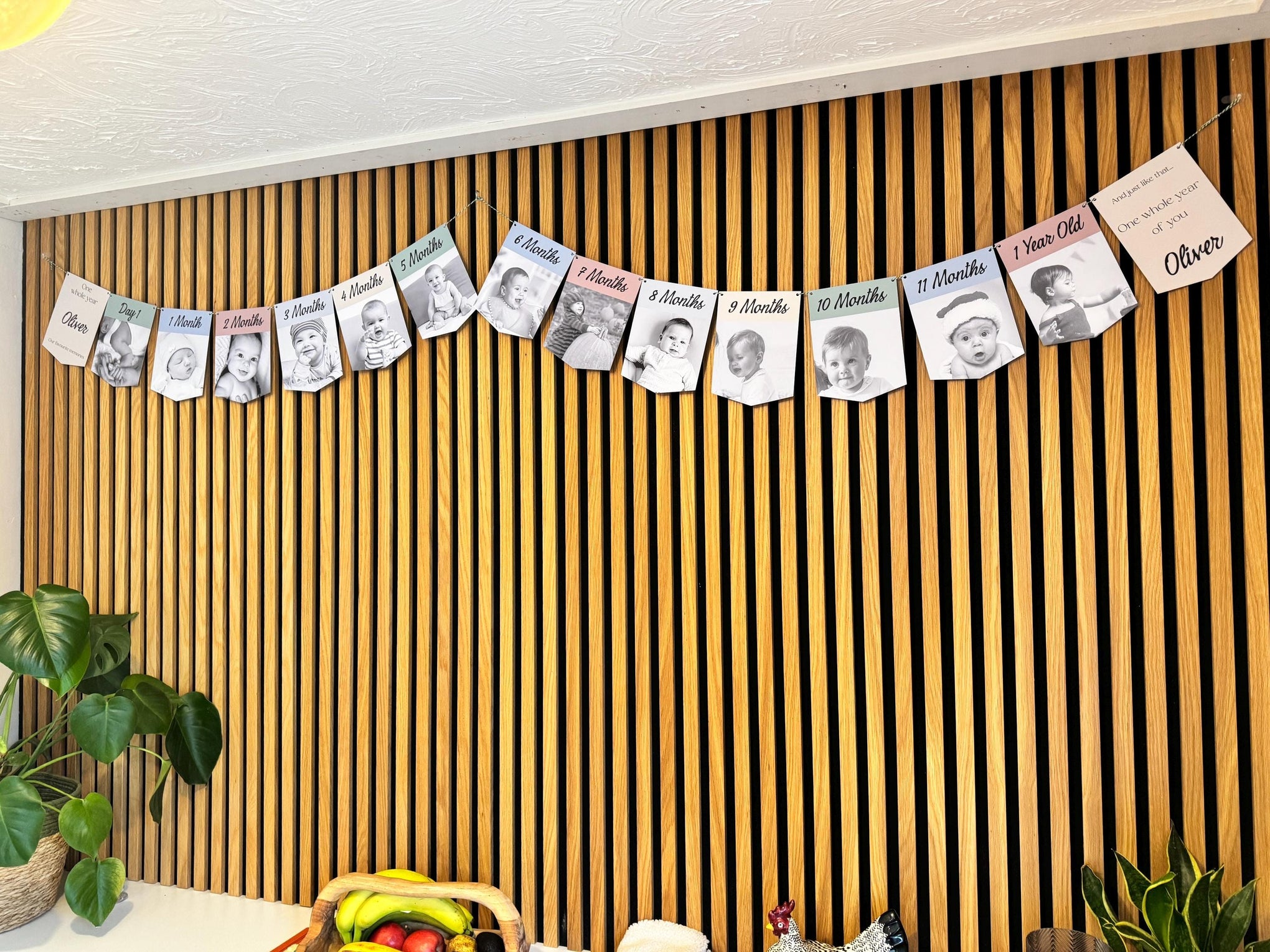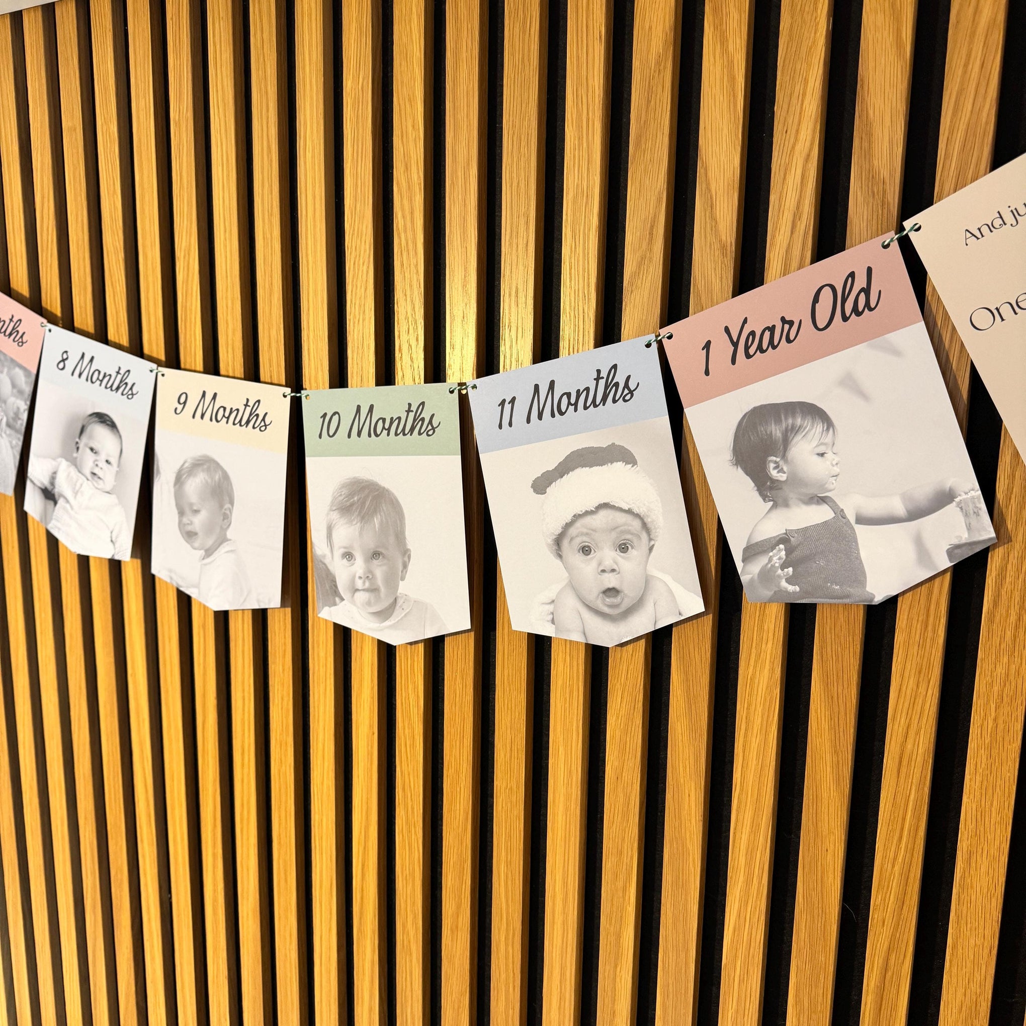 Celebrate your baby’s first year with a beautiful personalised photo bunting banner featuring their milestones from Day 1 to 1 Year Old. This keepsake-style banner is made using your own photos and your chosen colour palette, creating a meaningful decoration for a first birthday party and a lovely memory to keep afterwards.