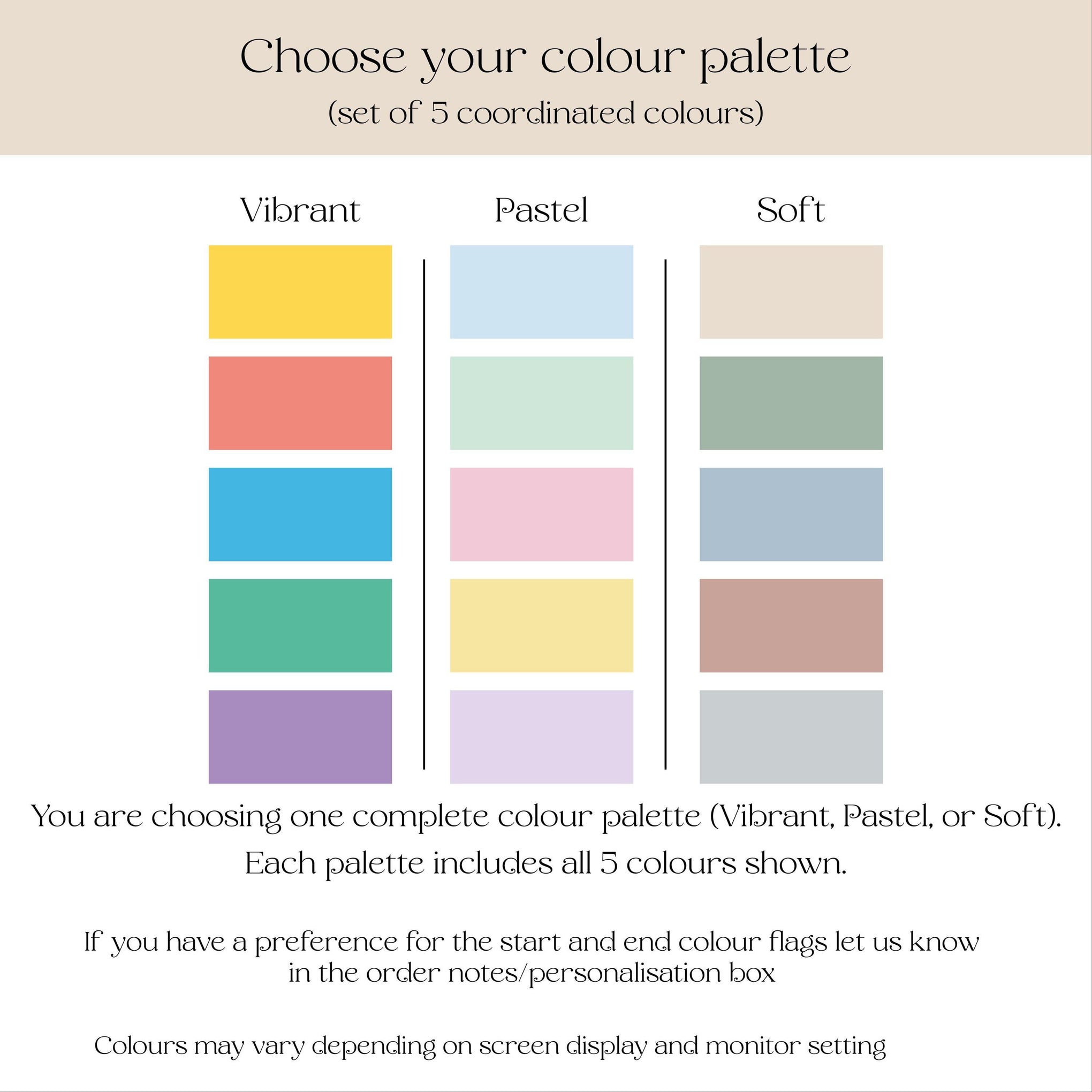 Each palette includes all 5 colours shown, used across the bunting in an alternating pattern. If you would like a particular starting colour from the palette just let us know in the personalisation box.