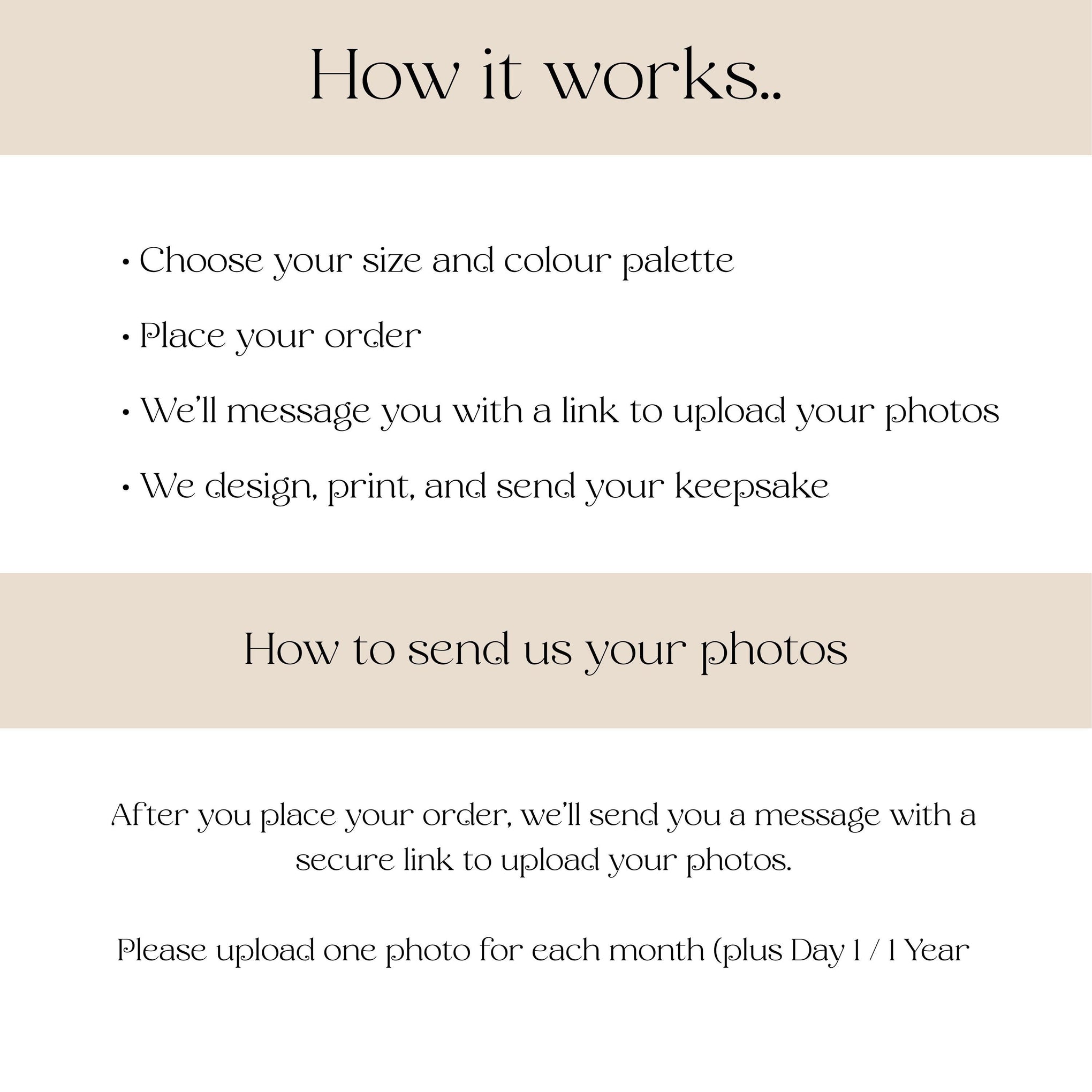 After ordering, you’ll receive a link to upload your images. Please name them by month or clearly mark which month they are for.