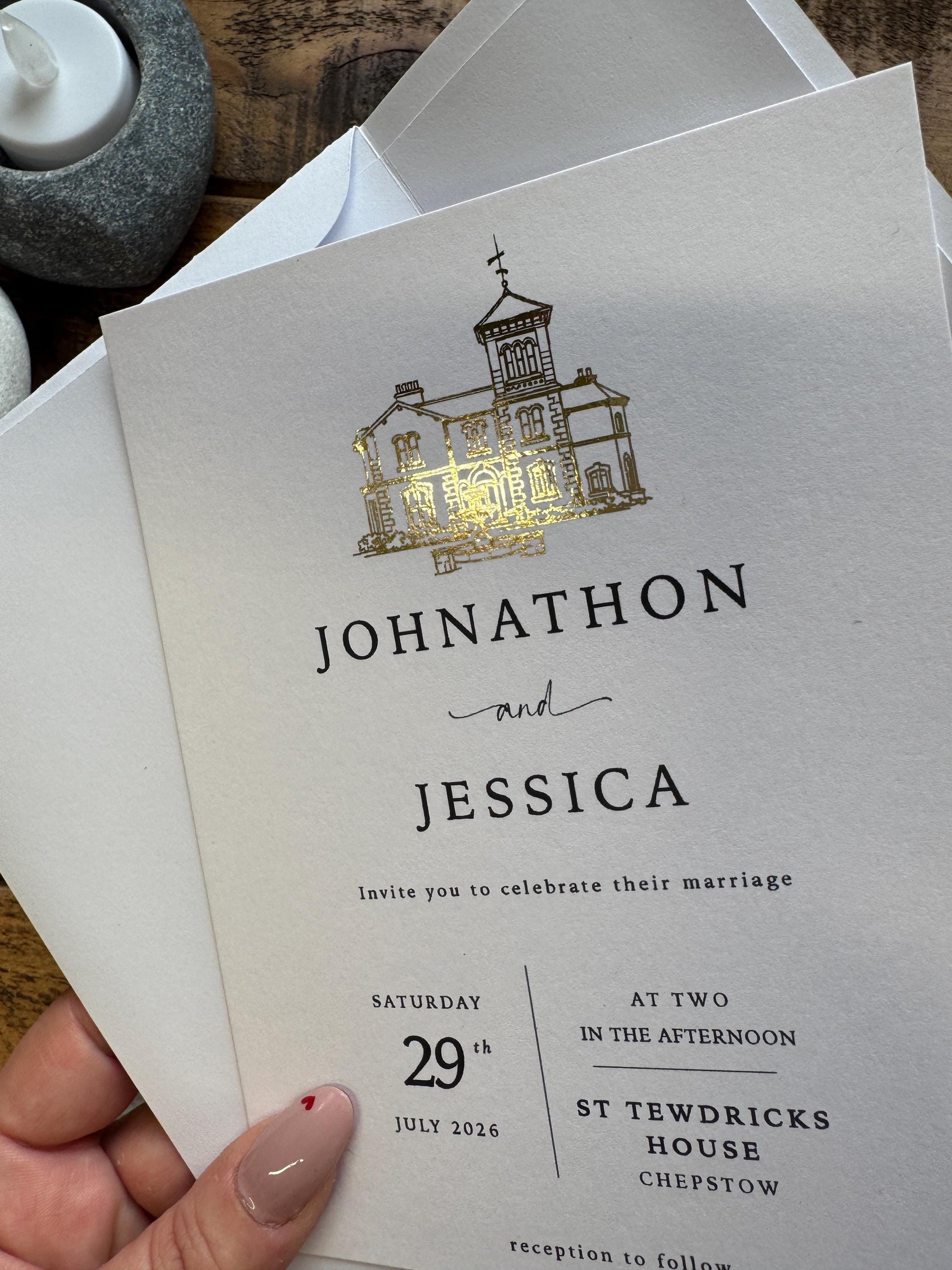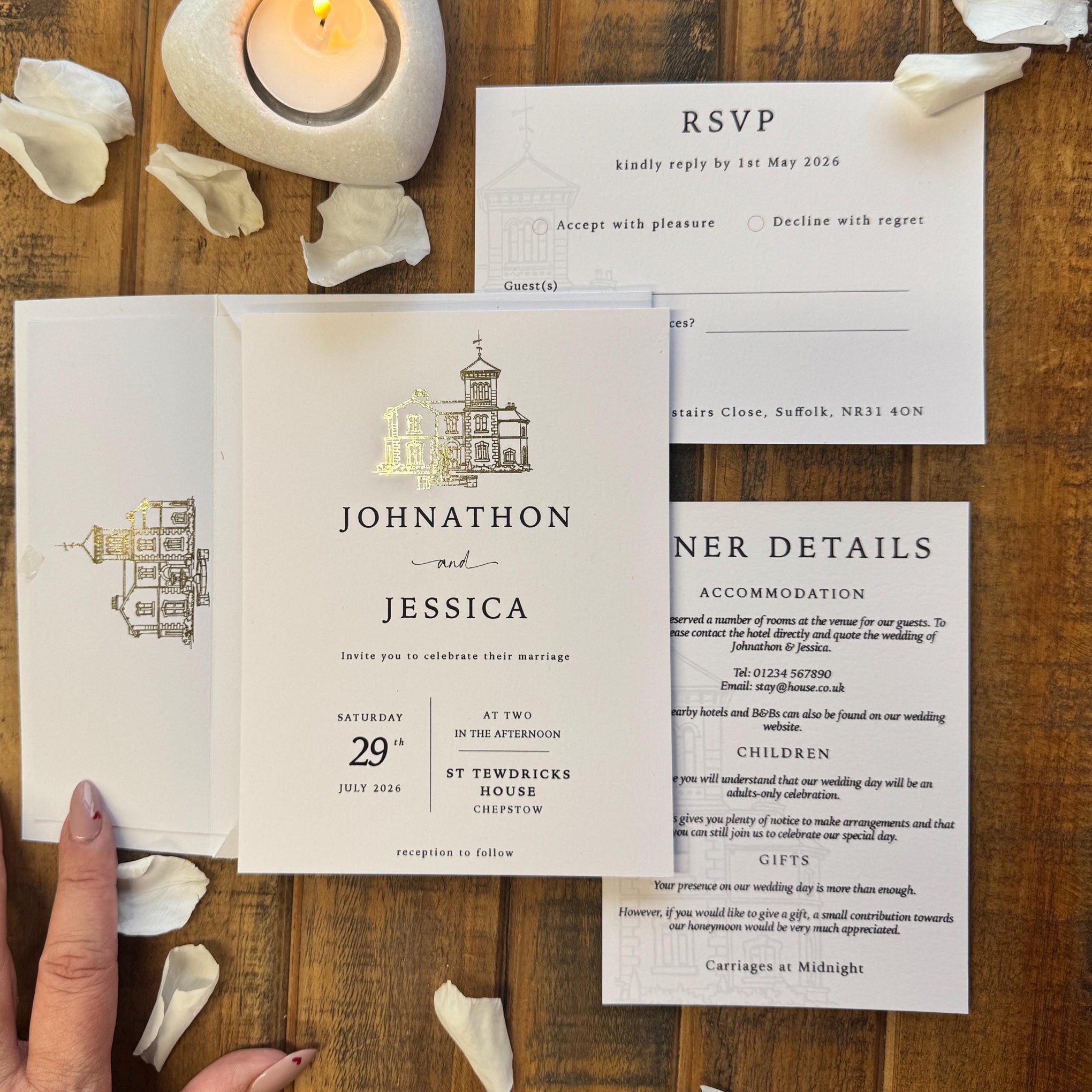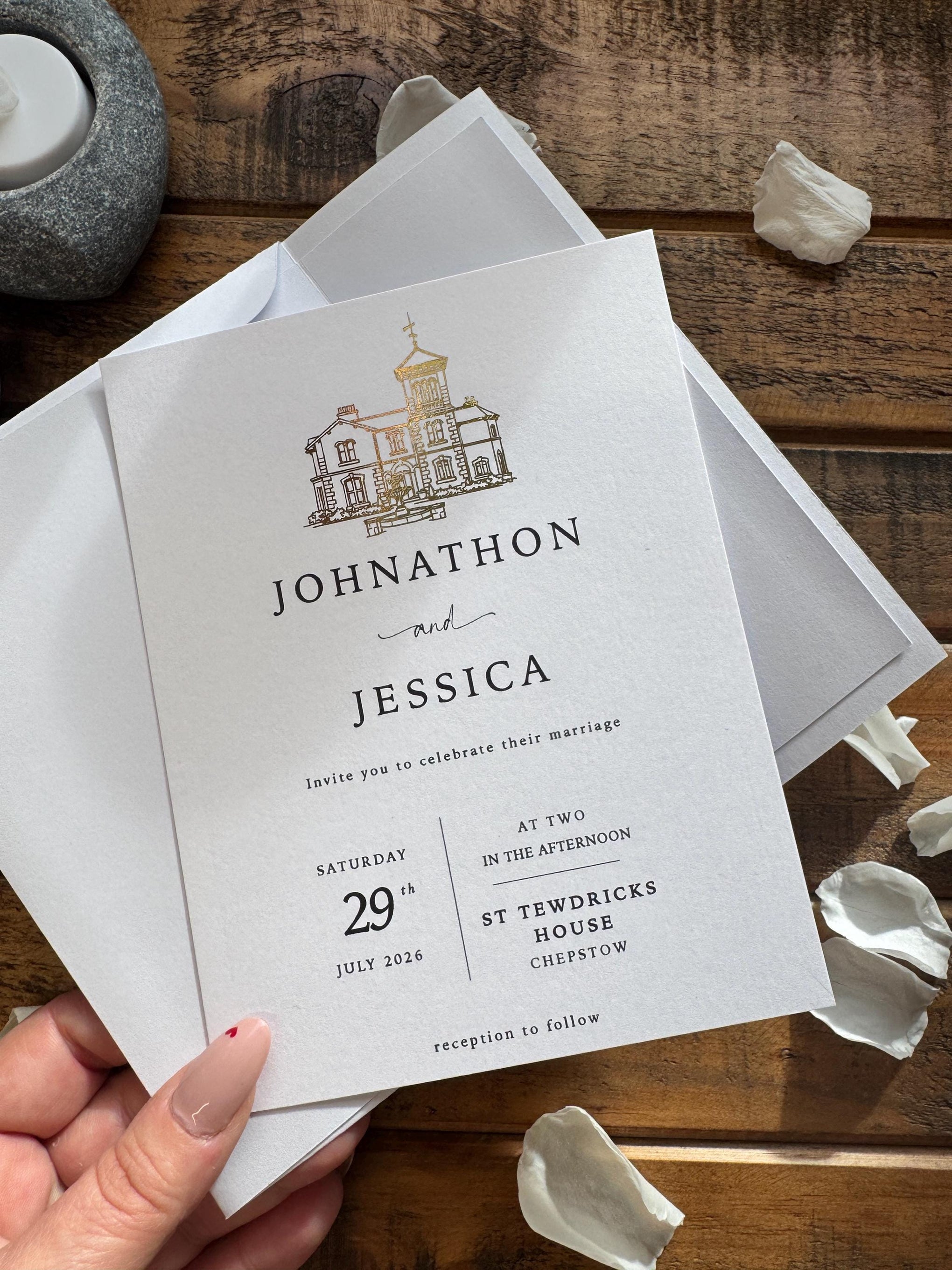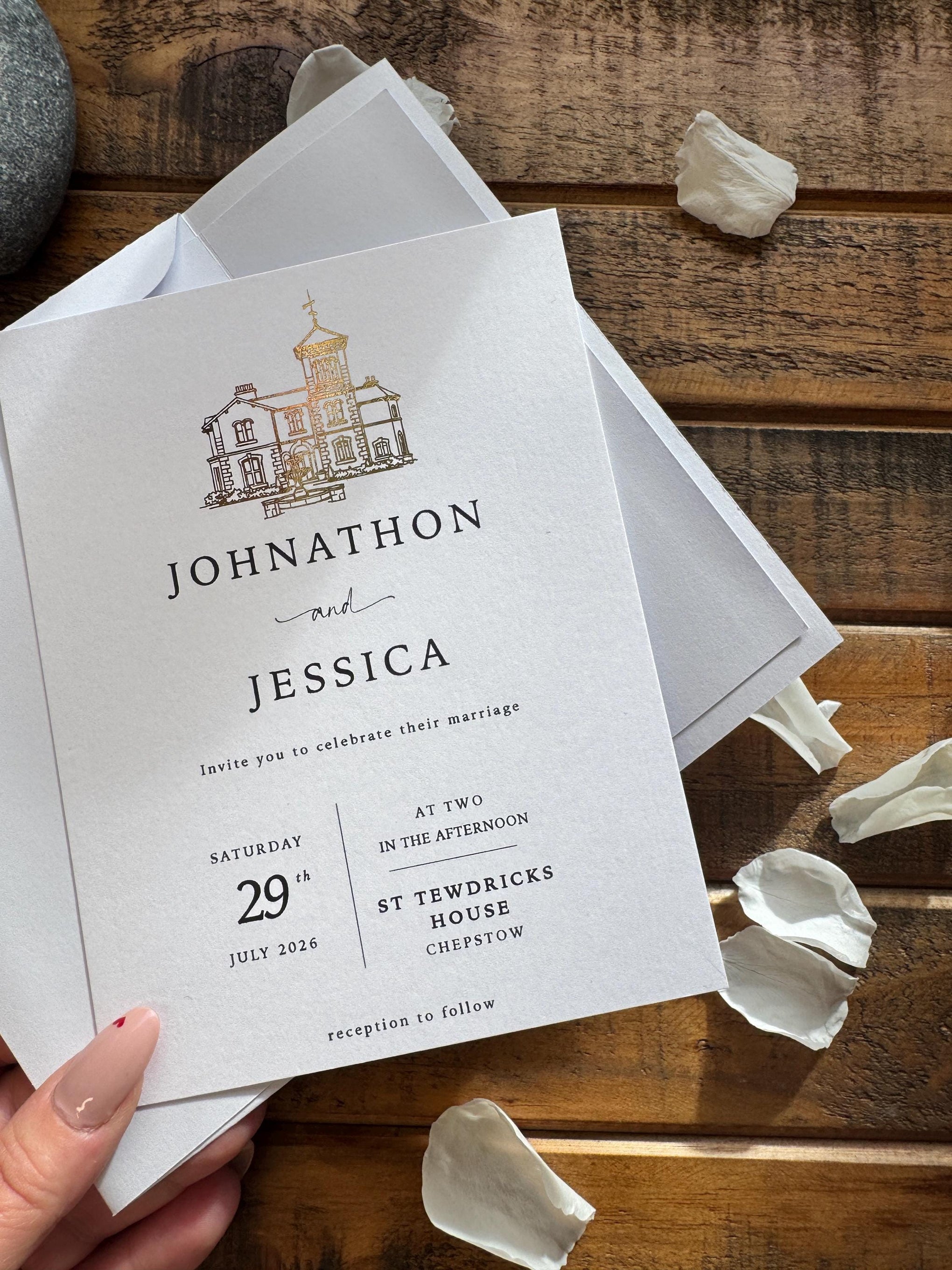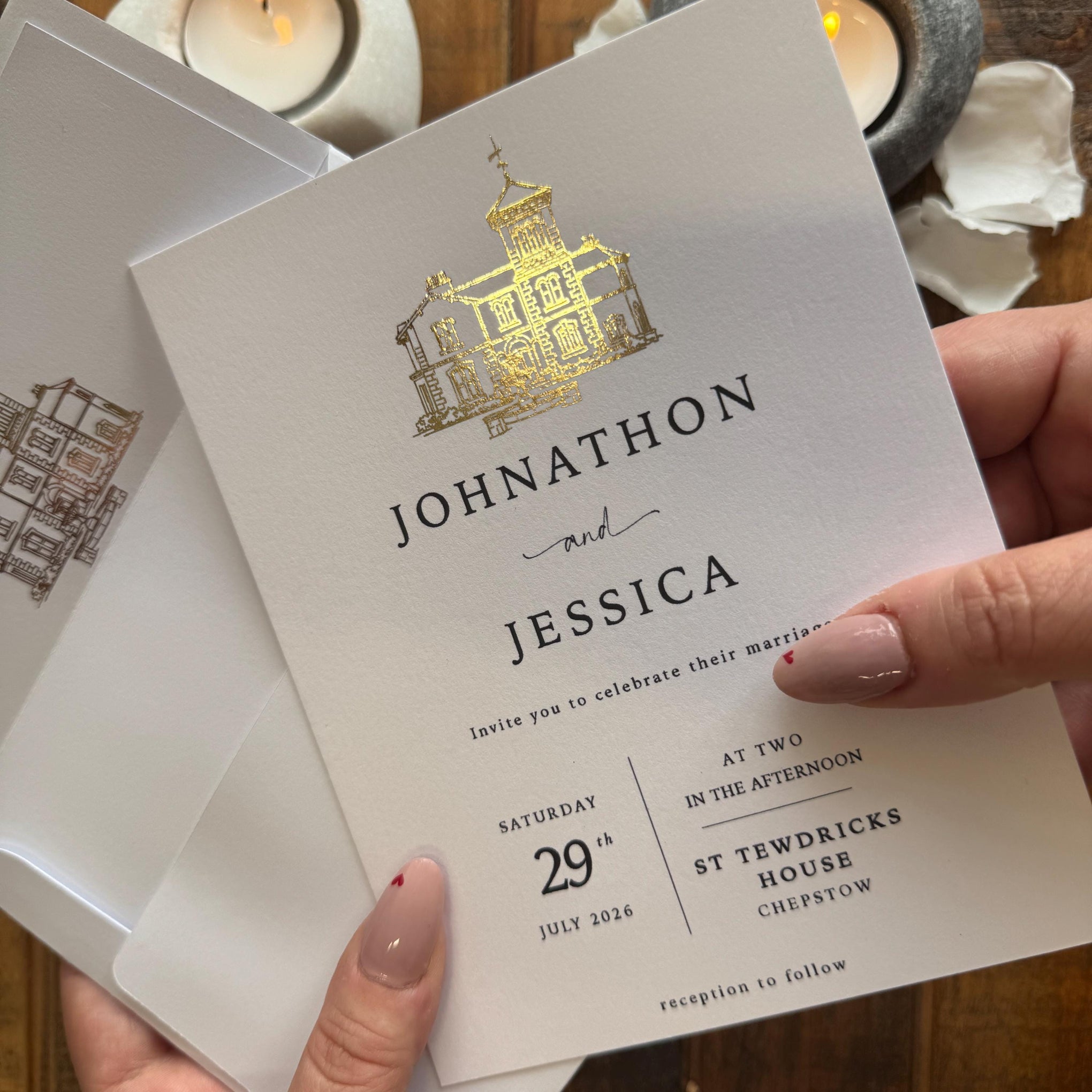The heritage collection, a timeless and elegant personalised wedding invitation set, featuring a beautifully foiled venue illustration, a handmade envelope with matching liner, and coordinating details and RSVP cards. Designed and made in our West Wales studio, this suite is perfect for couples looking for refined, classic wedding stationery with a luxury feel.