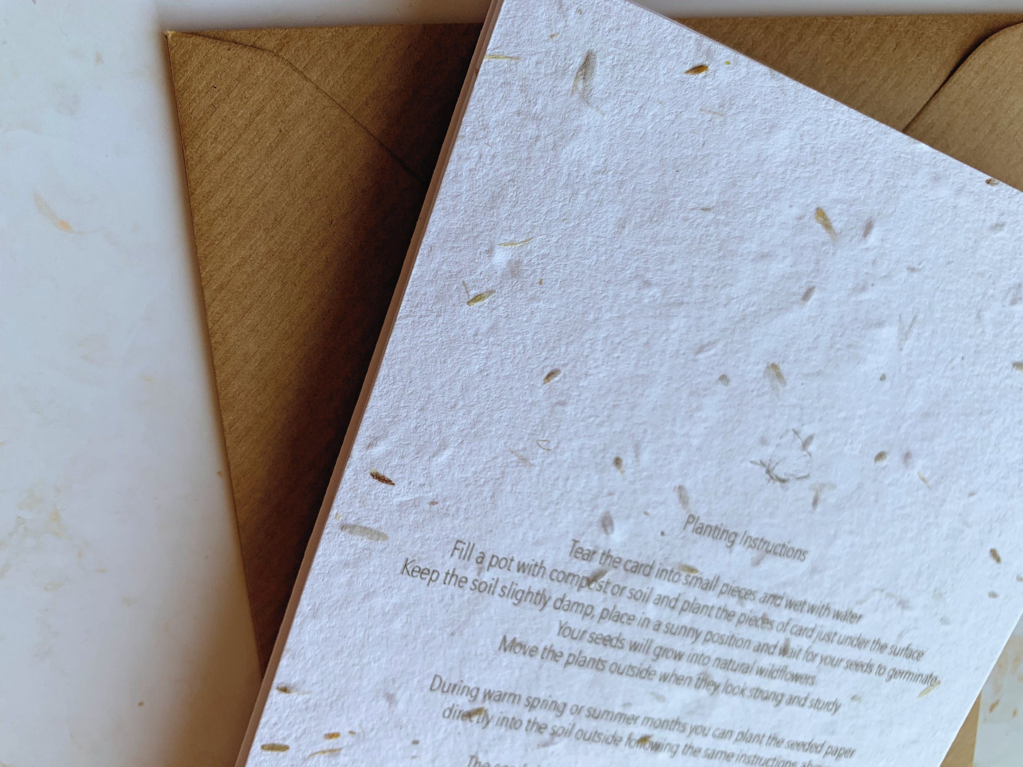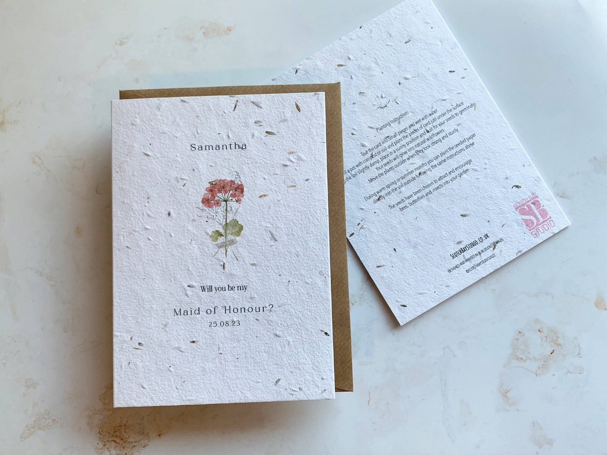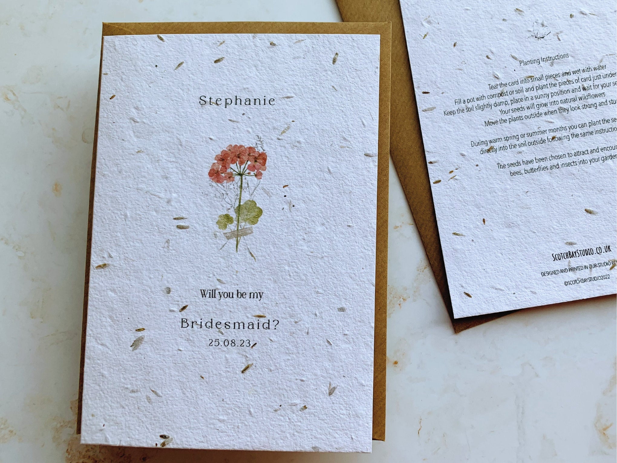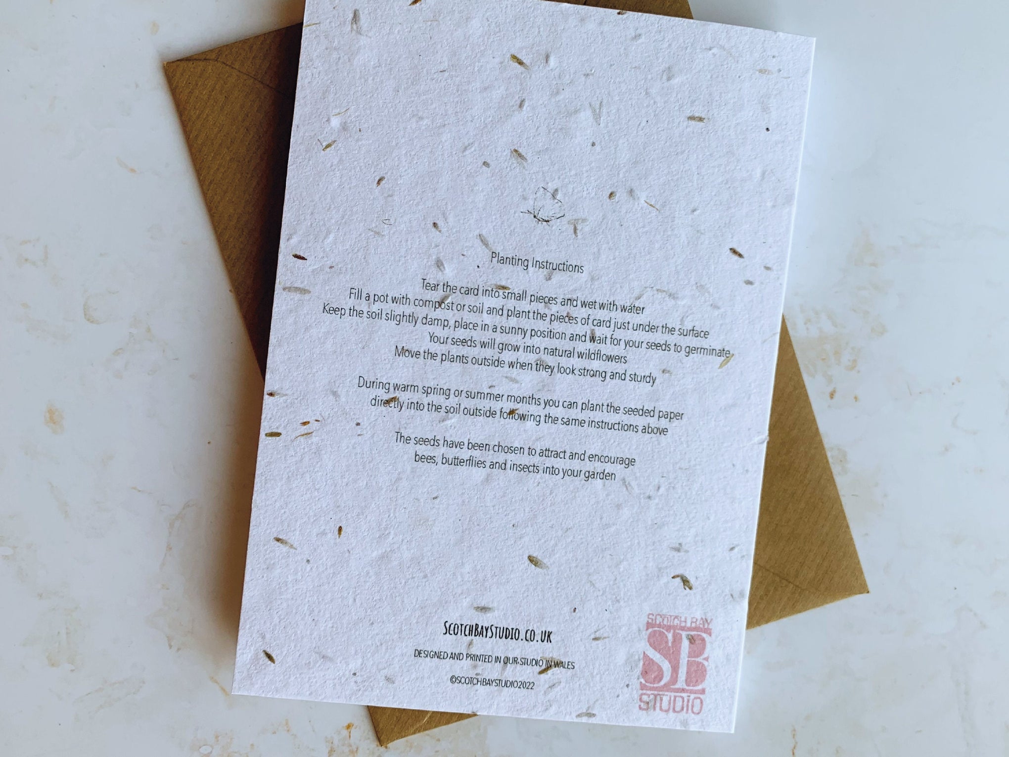 The card is A6 in size and printed on 300gsm seeded wildflower paper, which can be planted to help attract bees and butterflies to your garden. The delicate pressed flower watercolour design on the front adds a special touch and can be personalised with the recipient's name and the wedding date.
