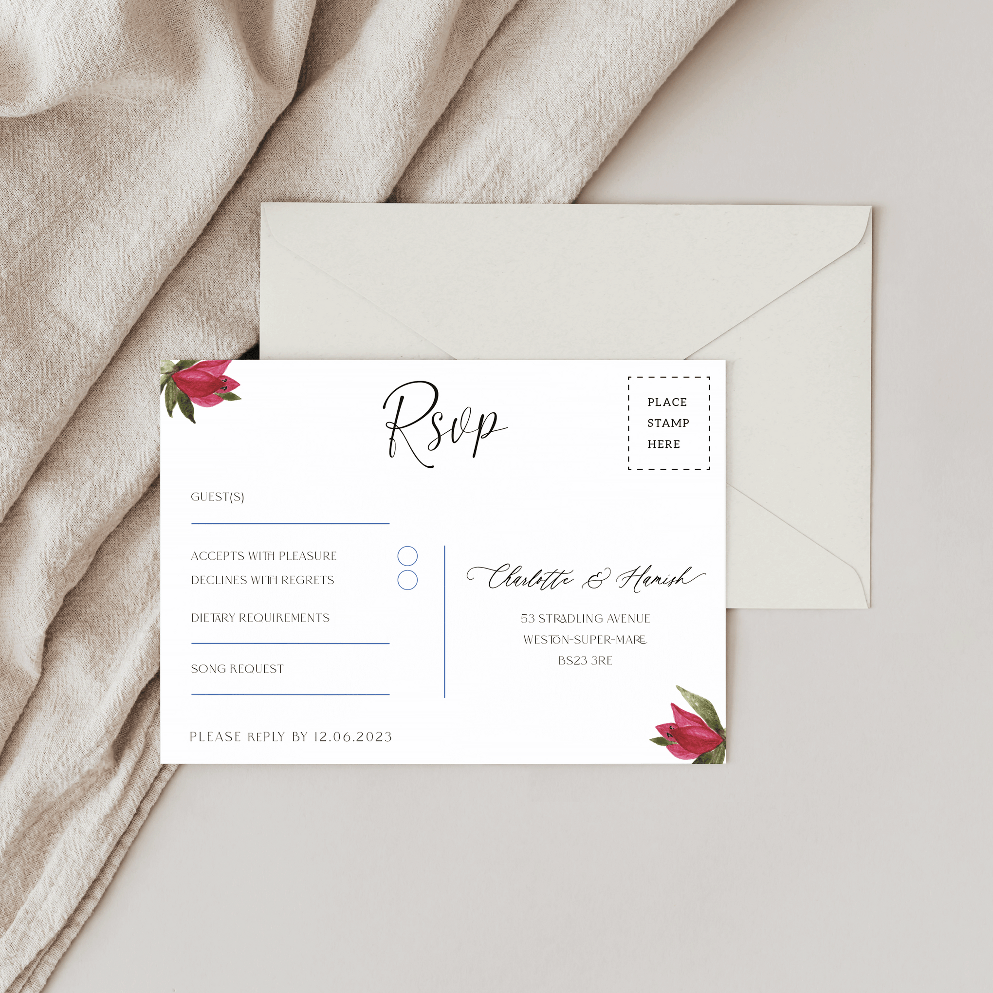 Each RSVP card comes with a vanilla envelope, providing an elegant option for your guests to send their responses. Alternatively, our postcard-style RSVPs are designed to be a simple and cost-effective solution for those who prefer to send their replies without an envelope.