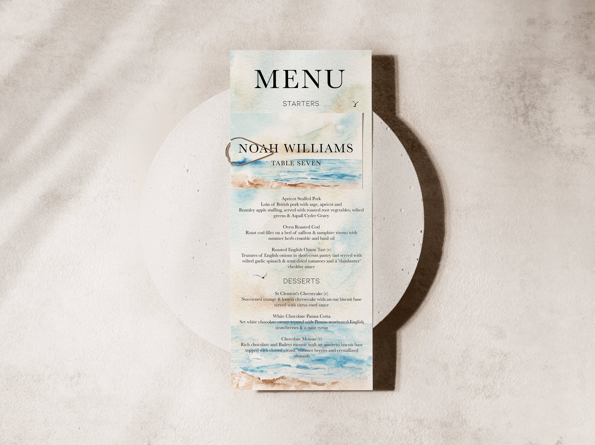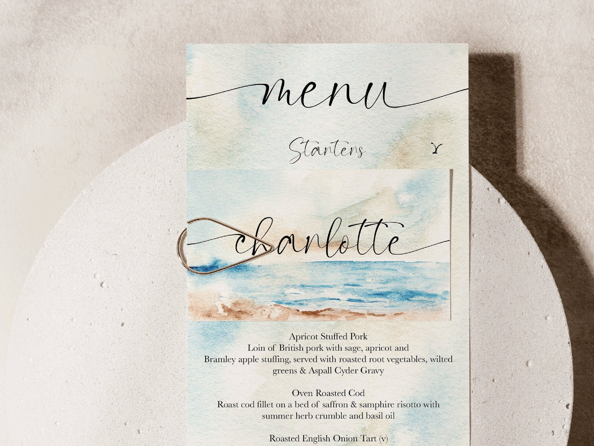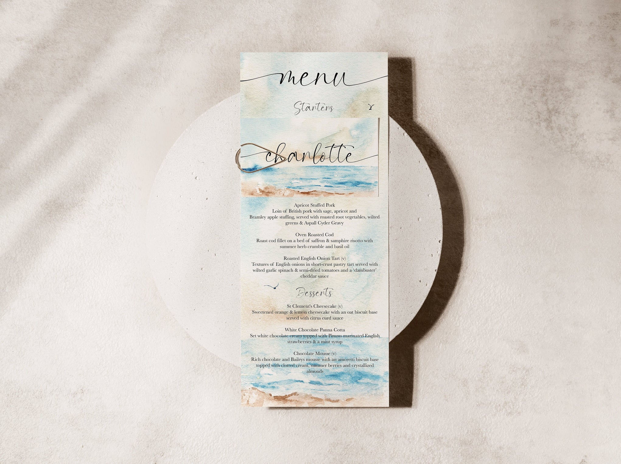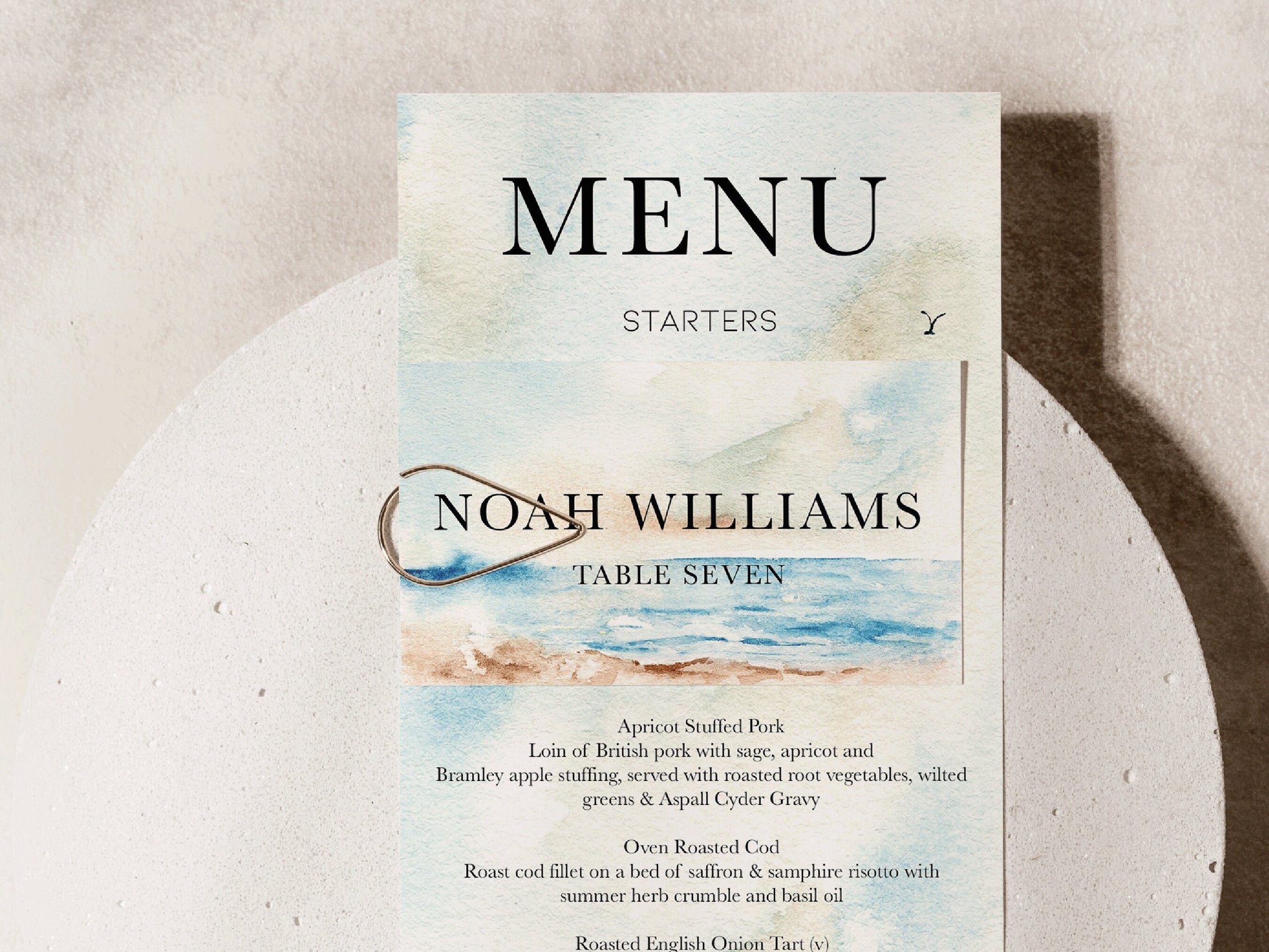 Make a statement with our seascape design wedding menus that come with an optional name place tag and clip. Your guests will be impressed with the luxury 300gsm textured Bianco card and watercolour seaside designs printed on our professional printers using high-quality pigment inks. Choose from gold or silver clips to match your theme.